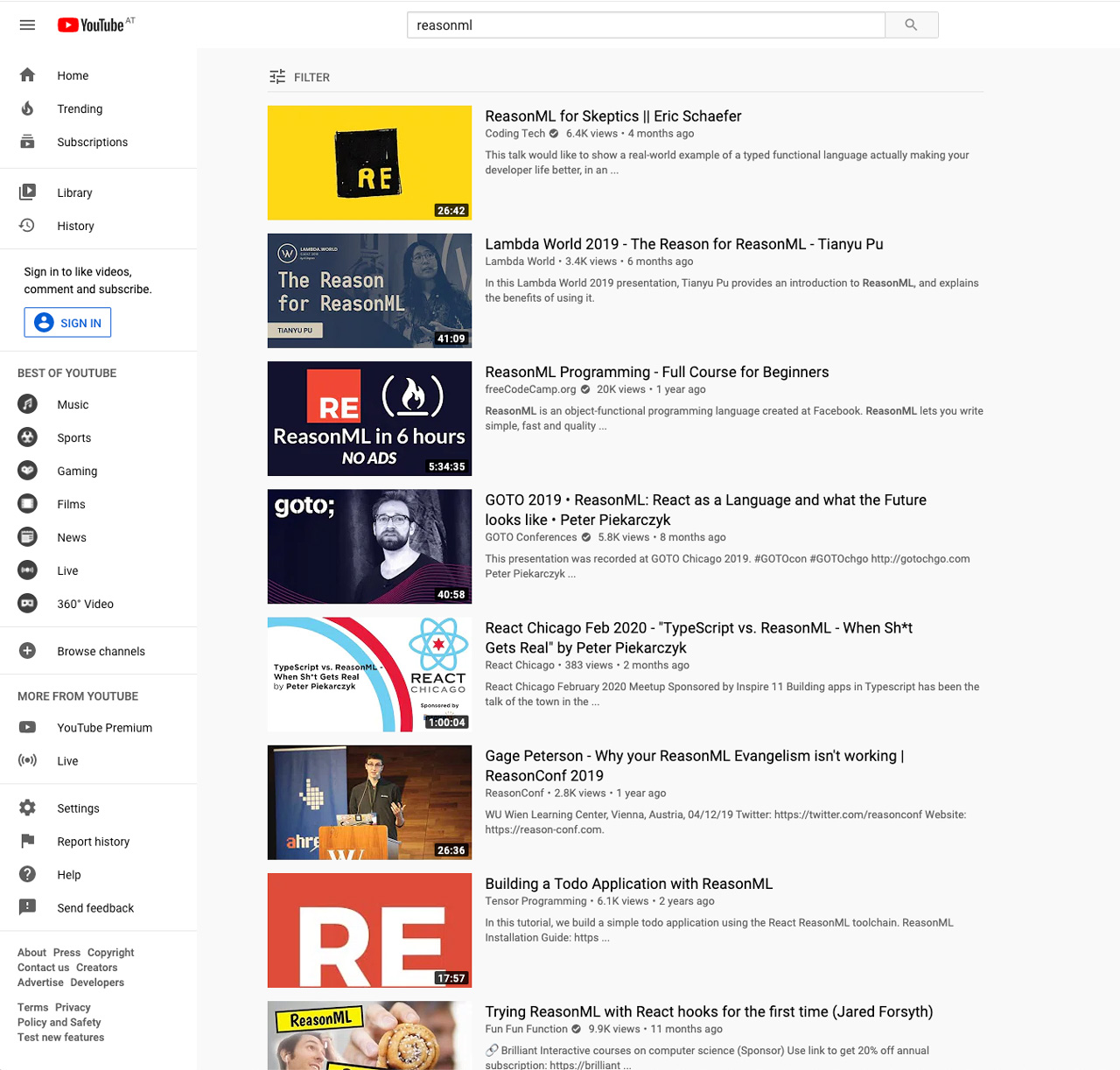 The same goes for other JS focused talks, such as GOTO2019 - ReasonML: React as a Language and what the Future looks like by Peter Piekarczyk (5.8k views) or high volume JS related Youtube channels like Fun Fun Function building a speed typing game with ReasonML and Comic Sans as editor font (19.8k views). There's still a ton more resources about ReasonML we didn't mention, since we were just talking about the first few Youtube hits there.